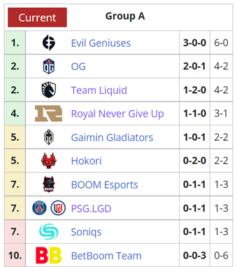 EG kini menjadi top dop Grup A, mengalahkan OG yang tampil bagus hingga seri ini. Mereka masih belum terkalahkan setelah dua seri menang melawan Soniqs dan PSG.LGD. EG akan bermain melawan Team Liquid dan Hokori di TI11 Group Stage Hari 2 dan kami tidak sabar untuk melihat apakah raja-raja NA tetap di puncak permainan mereka di The International.