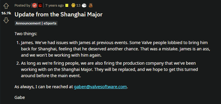 Sehari setelah turnamen dimulai, Valve tiba-tiba memecat 2gd dan CEO Valve, Gabe Newell sendiri memposting di Reddit untuk mengklarifikasi alasannya: “James adalah keledai dan kami tidak akan bekerja dengannya lagi.”
